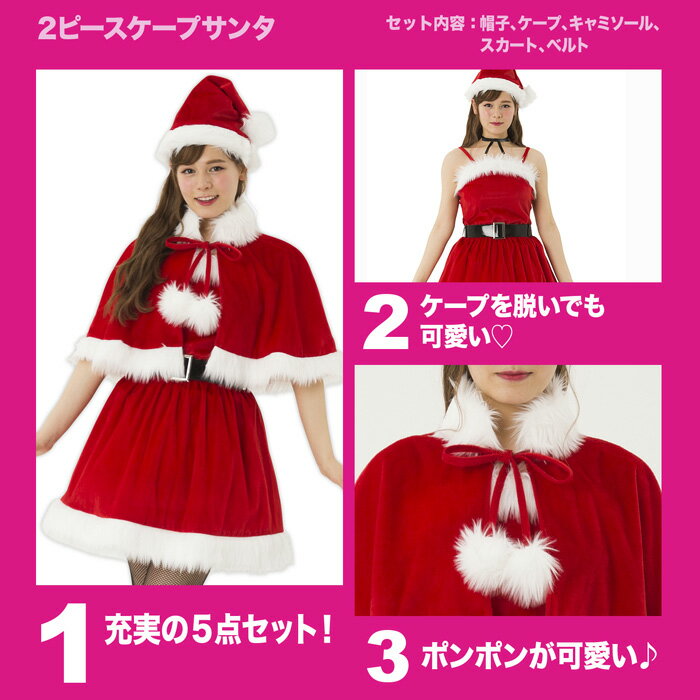 ≪Cristmas costume≫ 2ピース ケープ サンタベーシックなデザインなのに、ケープ・キャミソール・スカートと、セット内容が充実していて色々な着こなしができるサンタコスチューム!屋内外で寒暖差が激しい季節に嬉しい☆