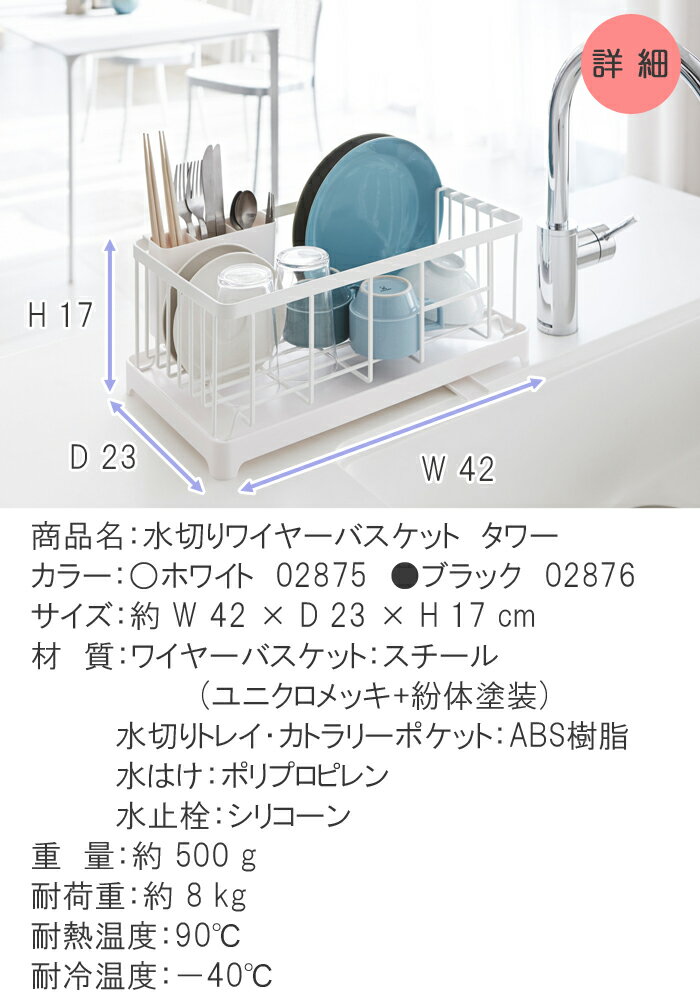 商品名:水切りワイヤーバスケット タワー カラー:○ホワイト 02875 ●ブラック 02876 サイズ:約 W 42 × D 23 × H 17 cm 材 質:ワイヤーバスケット:スチール(ユニクロメッキ+紛体塗装) 水切りトレイ・カトラリーポケット:ABS樹脂 水はけ:ポリプロピレン 水止栓:シリコーン 重 量:約 500 g 耐荷重:約 8 kg 耐熱温度:90℃ 耐冷温度:−40℃ YAMAZAKI ヤマザキ 山崎実業 カナケン 家具 Tower タワー おしゃれ ギフト プレゼント シンプル 白 黒 モノトーン インテリア 水きりトレー 水切りトレイ スリム おしゃれ 食器乾燥 洗い物 水切りカゴ 食器収納 食器洗浄 カゴ キッチン ホワイト 白 ブラック 黒 モノトーン 雑貨 北欧 水切りラック 収納 皿立て 菜箸 カトラリー 調理道具 グラス カップ 茶碗 自由自在 レイアウト シンク 食器 スリット まな板 鍋蓋 二層構造 フラット キッチン キッチン用品 雑貨 便利Sink Drainer Wire Basket 食器の水が直接シンクへ!レイアウトも自由自在!良く使う、グラス・カップ・茶碗・カトラリー・調理道具などもたっぷり収納。
